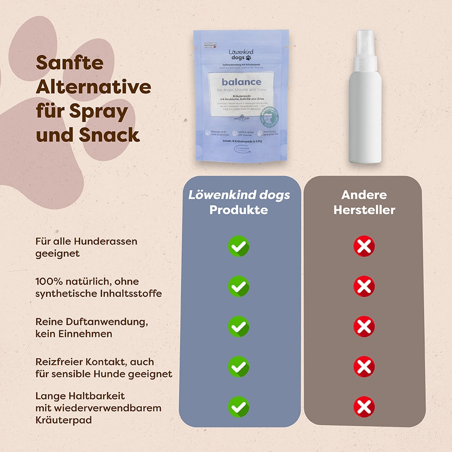 Kein Einnehmen, Einreiben oder VerschluckenDas Löwenkind Travel Kräuterpad hebt sich durch seine äußerliche Anwendung, die gezielte Wirkung bei Reiseübelkeit und die sanfte Duftentfaltung ab. Es ist besonders geeignet für Hunde, die keine Tabletten oder Snacks mögen und eine natürliche, nicht-invasive Lösung brauchen.